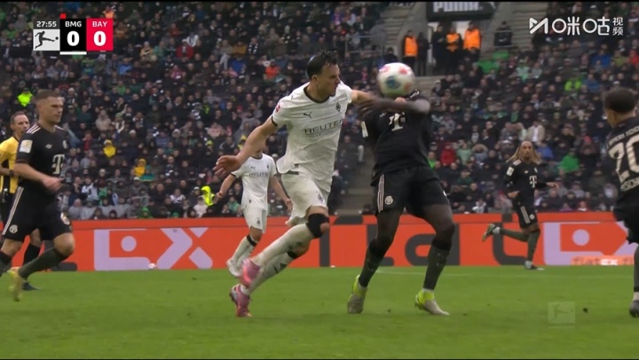 足球日报10月25日播报讯 德甲第8轮,拜仁客战门兴,比赛第28分钟,于帕与对方缠斗争抢球权,突然一掌把球拍走,因此吃到黄牌。
