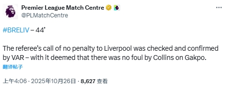 英超官方解释:主裁判未判给利物浦点球的决定经过VAR核查确认,认定科林斯对加克波并未构成犯规。